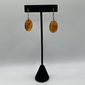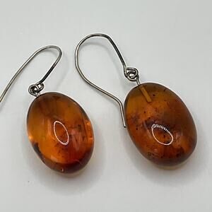 Vintage Amber Sterling Silver Earrings 1.5” Long Oval Natural Inclusions