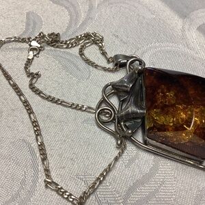 Vintage Amber Sterling Silver Pendant/Chain HUGE. I MEAN HUGE. STUNNING