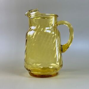 Add a warm glow to your table with this stunning vintage amber glass pitcher featuring a ribbed swirl pattern and classic pulled handle. The generous 64 oz capacity and elegant curved spout make it both functional and beautiful—perfect for lemonade, sweet tea, sangria, or simply displayed as a statement piece in your glassware collection.