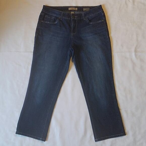 Vintage America Boho 5 pocket stretch denim blue jeans. These medium wash, straight leg jeans are in very good pre-owned condition. Tag size 8/28, however only have a shorter 24.5" inseam. Please look at the photos. They show the actual measurements taken laying flat. Waist 31", inseam 24.5", front rise 9".