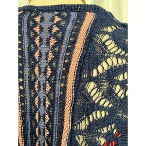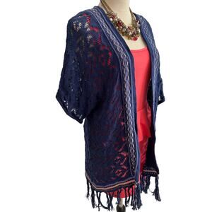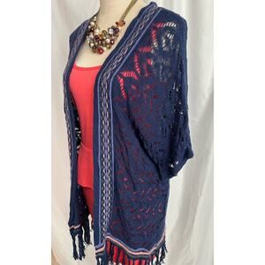 Vintage America Open Front Cardigan Blue and Pink Crochet Fringe Large