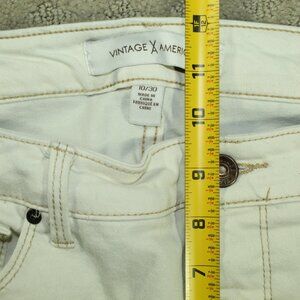 The Vintage America Women's 10 Wonderland Skinny Cream Tan Stitching Jeans are a stylish and versatile addition to any woman's wardrobe. Featuring a solid ivory color with light wash denim, these jeans have a slim fit with a mid-rise waist. Made from a blend of spandex and cotton, they offer a comfortable and flattering silhouette. The jeans are machine washable and feature a zip and button closure, along with pockets for added functionality. Perfect for city living, these jeans are both fashionable and practical for everyday wear.