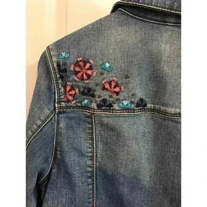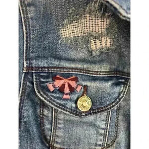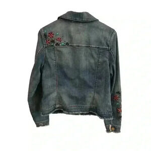 This vintage blue Jean jacket is a must-have for any fashion-forward woman. The jacket features an embroidered design on the front and has a frayed hem for a unique touch. The mid-length coat has long sleeves and a button closure, making it perfect for any occasion. The jacket is made from a cotton blend denim fabric that is both comfortable and durable. It is machine washable and has pockets for added convenience. This jacket is perfect for any season, whether you're looking for a winter layer or a summer jacket.