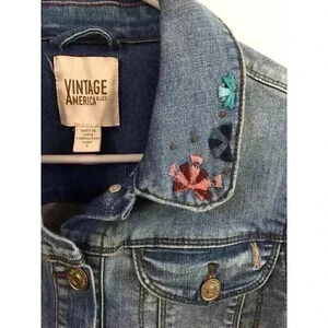 Vintage America Womens Small Blue Jean Jacket Embroidered Frayed Hem Light Wash