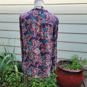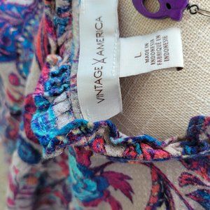 Vintage America soft woven viscose prarie style blouse in a beautiful multicolor very vivid floral print using turquoise, purple, azure blue, hyacinth orange and red burgundy on tan background makes for a bright fall style. Smocking front detail and ripply collar and cuffs. 6 pearl buttons down front. Ald 2 pearl buttons on sleeves Size large. Pit to put when closed is 22", length is 27"