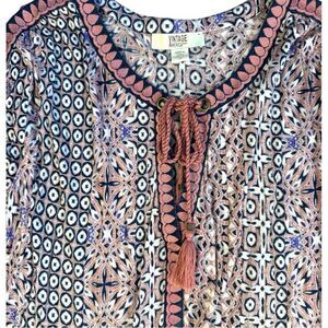 This Vintage America blouse offers a relaxed fit with a blue, white and pink color scheme. The 3/4 sleeves and tassel tie front detail add a touch of bohemian elegance to its comfortable design. Versatile style can be dressed up for a stylish business casual look, or dress down for a night out.