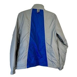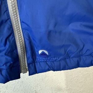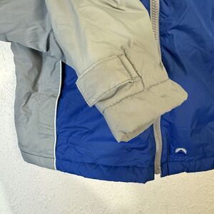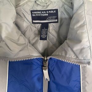 This vintage American Eagle Outfitters jacket is a must-have for any winter sports enthusiast. The jacket is made of durable nylon and features a zip closure to keep you warm and comfortable on the slopes. The blue and gray color scheme is perfect for any winter outfit, and the insulated design will keep you warm and cozy during your favorite activities.
