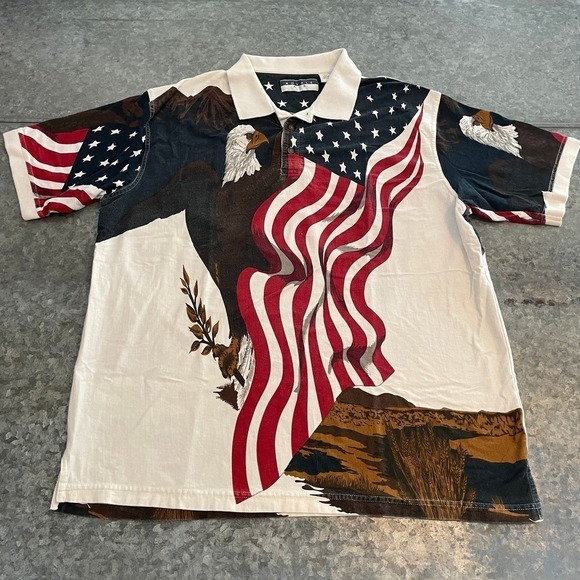 Vintage American Eagle USA Flag All Over Print Polo Shirt Mens XXL Royale Air