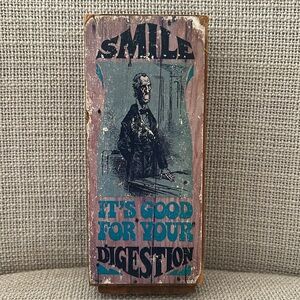 Standing wooden plaque with sticker on both sides One side says "Have a super day" and the other side reads "Smile its good for your digestion".