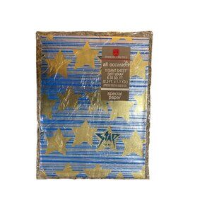 Vintage American Greetings Star Grad Gift Wrap NEW Blue Gold Star Metallic Gradu