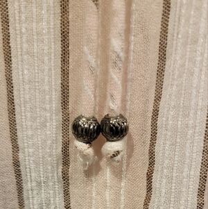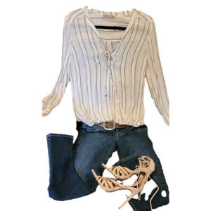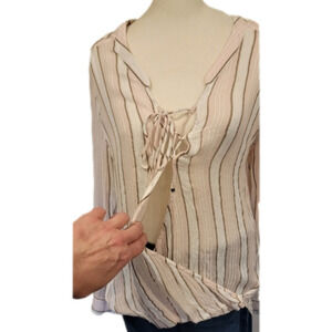 This is a beautiful top with the stripes and the beautiful colors. No size tag, but fits like M