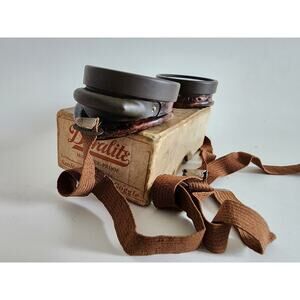 Authentic vintage Duralite welder’s goggles from American Optical Company. Includes original box, brown adjustable strap, and red lens cloth with printed safety and care instructions.