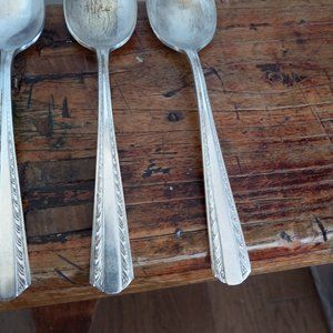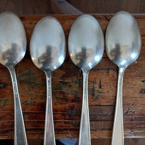 Vintage, likely from 1936. Set of six American Silver Co. silver plate soup spoons in the Camelot Harvest pattern. Each measures approximately 6.75" x 1.5". Each have scratches, staining/plate loss and tarnish. Handle on one spoon is slightly warped (last photo). Very usable and, overall, good condition for their age.