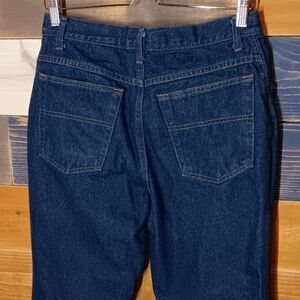 Vintage American Weekend denim jeans in a size 32 x 30. These are made in the USA and 100% cotton. They are a dark blue with front and back pockets. The closure is a zip and button closure. They are in excellent condition.