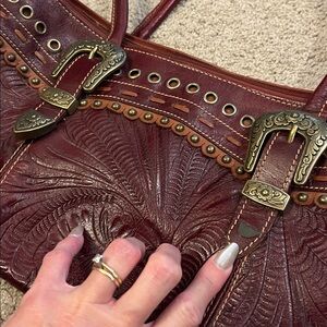 American West tooled red leather handbag. Bag does have quite a bit of wear, the inside of one handle has hardened. See photos for more wear details. Would be great for repair, reworking, or to use as is.