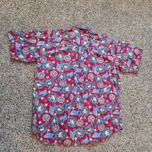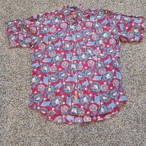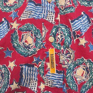 The product is a vintage America's Cup 1995 short sleeve shirt by BD Baggies in red, men's size large. Made from 100% cotton with a woven fabric type, it features a classic fit with a collared neckline and button closure. The shirt is machine washable and has embroidered logo on left chest, ideal for occasions such as travel, casual wear, or workwear. With a patriotic, sailing theme and a 90s retro vibe, this button-up shirt is a unique addition to any wardrobe.