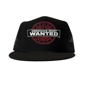 Retro America’s Most Wanted black snapback trucker hat. Features bold front patch logo with red seal-style design. Mesh backing with adjustable snap closure.
