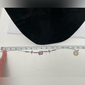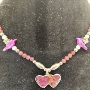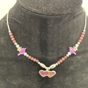 Vintage necklace featuring purple amethyst beads with heart charming bird accents, a double heart pendant, and liquid silver chain. Good vintage condition.