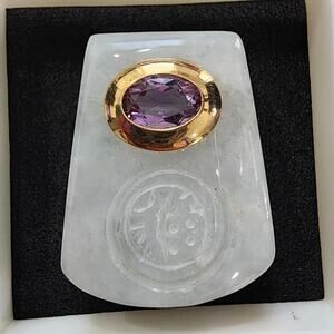 Free-form light green jadeite jade gradient block slide pendant from Hong Kong Features a carved design on the front side and a 14-karat yellow gold bezel that is set with one 5x7mm oval cut amethyst gemstone