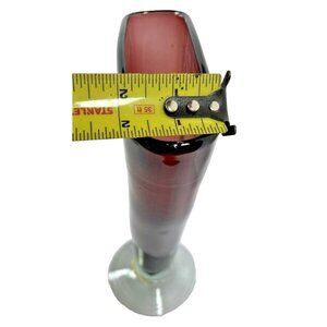 This vintage amethyst glass fan vase showcases a beautiful transition from amethyst to clear glass base at a stunning 11" height and almost 6" fan width. 2" wide opening and a 4.25" round base.