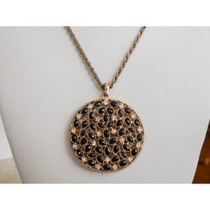 Bold Amrita Singh black and silver rhinestone medallion necklace. Medallion has 2 1/4 inch diameter has black and diamond rhinestones. Twisted gold tone chain is 18-21 1/2 inches. some minor plating loss near clasp. signed with Amrita Singh hang tag