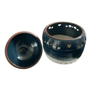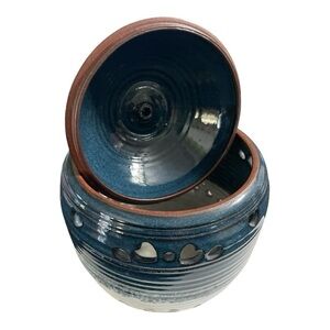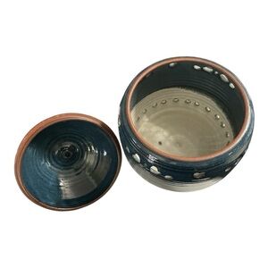 Stoneware Garlic Jar With Lid Midnight Blue and white. It is a true work of art. The unique Jar can be used for several things. The round shape and 7" width make it perfect for use as a decorative piece. Crafted from clay using the pottery production technique, this handmade Jar is a vintage piece from the 1980s. The item width is 7" and the item height is 9” including cover. This art pottery piece is perfect for collectors or for those who appreciate unique and beautiful. No chips or cracks.
