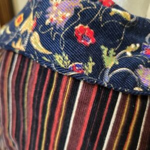 large hook and eye closure lined in fuchsia .Elevate your style with this chic women's blazer featuring a striking striped pattern and floral accents. Perfect for any occasion.