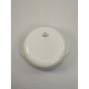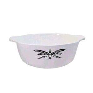 This is a vintage Anchor Hocking casserole baking dish cookware in a black wheat design. It is made of white and black glass, measuring 7 inches. This casserole dish is a part of the Casserole Baking Dish Cookware line by Anchor Hocking, a brand known for its quality glass products. It is an original vintage piece made in the USA.