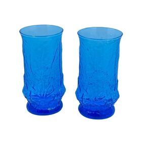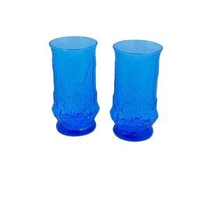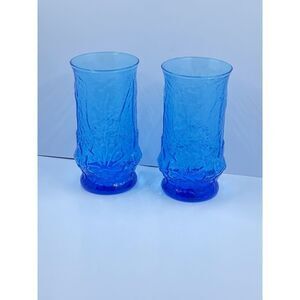 Vintage Anchor Hocking Blue Rain flower 12 oz Glass Tumblers 5 1/2" - Set Of 2.