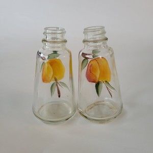 Vintage Anchor Hocking Clear Glass Salt & Pepper Shakers Peaches Hand Painted.