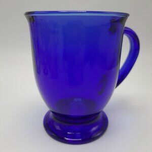 This cobalt blue glass coffee mug by Anchor Hocking exudes timeless elegance. Its durable glass construction ensures lasting quality, making it both functional and decorative.