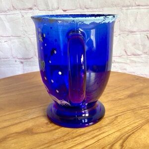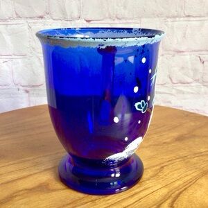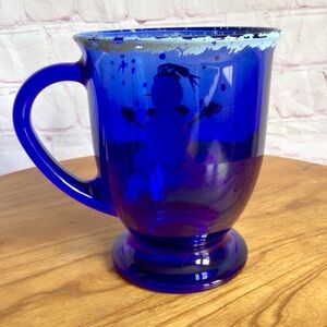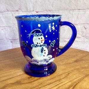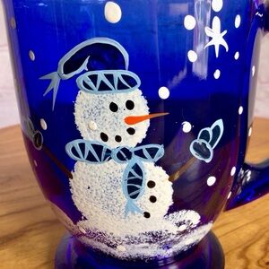 Experience the charm of winter with this vintage Anchor Hocking hand painted cobalt blue glass snowman mug, perfect for your dining collection. This elegant mug features a striking cobalt blue background adorned with a delightful white snowman design, creating a festive atmosphere for your favorite beverages. Its pedestal base and comfortable handle make it both stylish and practical, ideal for cozy winter mornings or holiday gatherings. This mug measures approximately 5” tall, 5 1/4” wide including the handle. Great vintage condition. No chips, cracks or repairs. Smoke free home.
