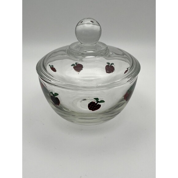 1 pre owned Vintage Glass Anchor Hocking Red Apple Covered Small Sugar Bowl Bowl & lid. Anchor Hocking Red Apple line, which was popular in the 1960s and 1970s. This line featured various kitchen items with the distinctive red apple pattern. Excellent condition with minor signs of use. No visible cracks or imperfections.