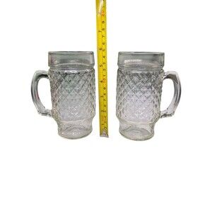 Add some vintage charm to your collection with this set of 2 Anchor Hocking Diamond Cut glass beer mugs from the 1960s. The diamond cut pattern on the clear glass adds a touch of elegance and sophistication to your table setting. These mugs are perfect for sipping your favorite beverage and are sure to impress your guests. Crafted from high-quality glass, these mugs are durable and will last for years to come. The set includes two mugs and is a great addition to any collection.