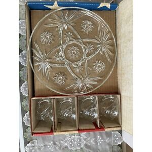 Vintage Anchor Hocking snack set features a beautiful star of David pattern on clear pressed glass material.