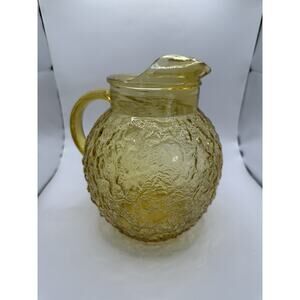 The Vintage Anchor Hocking Fairfield Starburst Amber Glass Pitcher is a round, pressed glass pitcher made in the 1960s. This Mid-Century Modern piece features a glossy finish and a vibrant amber color with the iconic Fairfield Starburst pattern. Manufactured by Anchor Hocking in the United States, this vintage original pitcher is a unique and collectible addition to any home decor, measuring 9 inches in height and 6 inches in width. Ideal for both practical use and as a decorative piece, this pitcher is sure to stand out with its retro charm and quality craftsmanship. It weighs 1.11 lbs and is in excellent condition with no damage.
