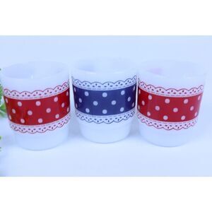 Vintage Anchor Hocking Fire King Glass Mugs SET OF 3 Blue/Red Lace Polka Dots