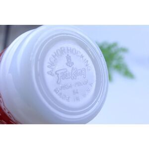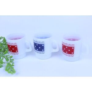 This set of three vintage Anchor Hocking Fire King glass mugs is perfect for any occasion. The glossy finish and decorative polka dots lace pattern in red and blue add a touch of mid-century modern style to any kitchen. The stackable design and 8 oz capacity make them practical for everyday use.