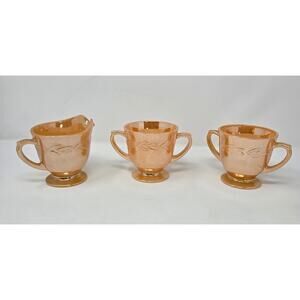 This is an Anchor Hocking Fire King Peach Luster Cream and Sugar Set. It includes a handled cream with two open sugars. These are the peach luster line with the laurel leaf design. They are footed and an Iridescent peach finish. They are in very good condition with no damage or defects. They are 3 inches tall and 3.25 inches diameter.