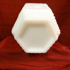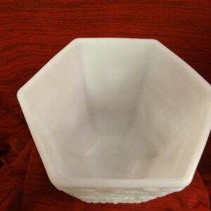 This six sided Anchor Hocking Fire King ware vase is in excellent condition, no chips or cracks. It is the traditional grape pattern. It measure 7 inches tall and 6 1/2 inches wide. It was made in the USA.