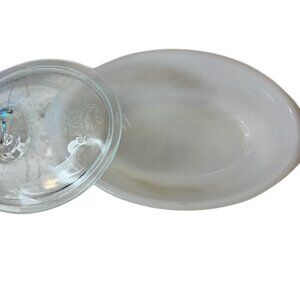 This milk glass casserole dish features a classic oval shape adorned with a gold wheat design, paired with a clear glass lid for functionality and style.