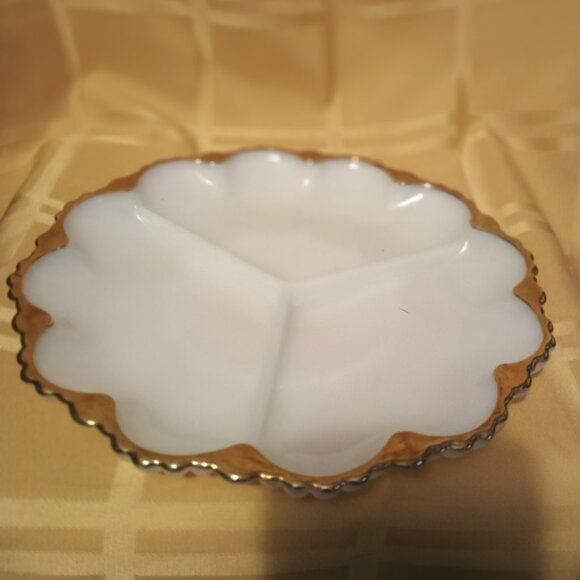 Vintage Anchor Hocking Fire-King milk glass divided relish tray/dish with a scalloped edge and gold trim