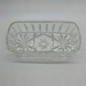 A beautiful piece from the Early American Prescut line, this Anchor Hocking glass butter dish showcases the iconic Star of David design, adding timeless elegance.