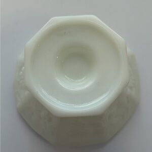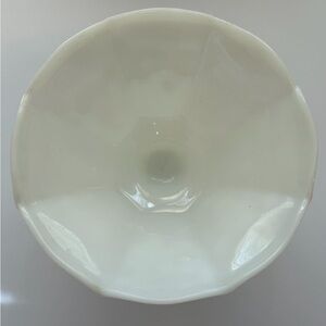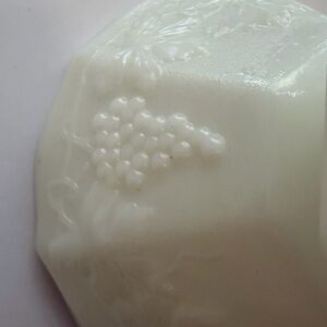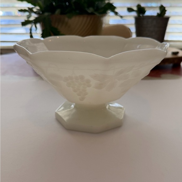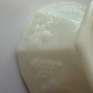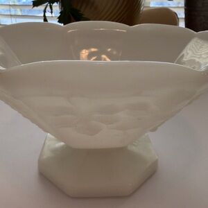 Antique vintage Anchor Hocking milk glass pedestal fruit bowl. Harvest Grapes is the pattern name. Pristine condition. No chips cracks or discoloration.