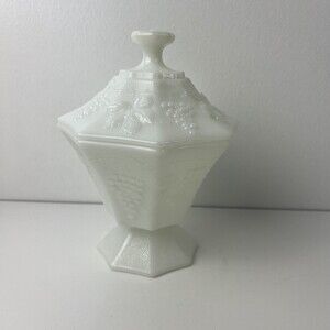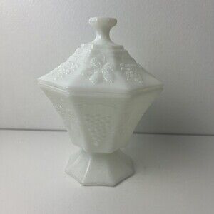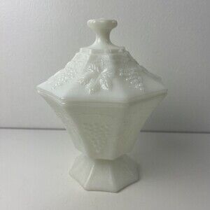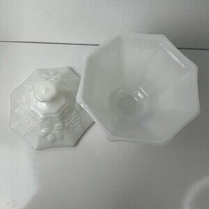 Add a touch of vintage charm to your home decor with this beautiful milk glass candy dish by Anchor Hocking. The octagonal shape and glossy finish of this dish make it a perfect addition to any kitchen or dining area. The white color of the dish is accentuated by the beautiful Harvest Grapes design.