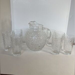 Vintage Anchor Hocking Lido Milano Glass Crystal Clear Ball Pitcher w 8 glasses