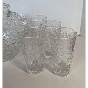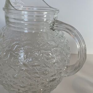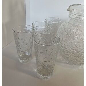 Mid-century Glass lemonade or ice tea pitcher with 8, 10ounce glasses. Ball pitcher contains 3quarts. Entire set is in Excellent condition, no chips or cracks.