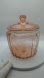 Keywords: Depression glass, vintage, glassware, pink glass, candy dish, covered jar, floral decor, embossed glass, kitchen storage, vanity decor, collectible, art deco, chintz