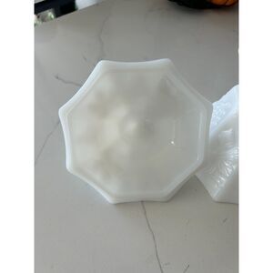 Beautiful grape pattern milk glass, lidded candy dish by Anchor Hocking. No significant scrapes, chips, or flea bites that I've found. Please zoom in on the photos to verify the condition for yourself.