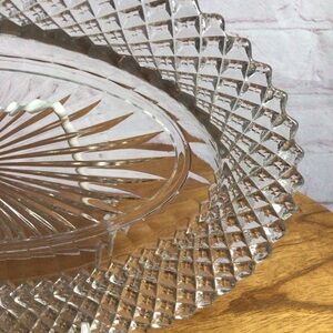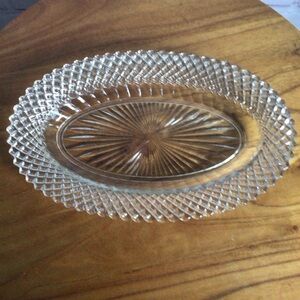 This elegant Vintage Anchor Hocking Miss America serveware platter is crafted from clear glass, featuring a stunning diamond pattern around the rim and a radiant starburst design at its center. Perfect for dining occasions, its classic style adds a touch of sophistication to any table setting. This discontinued pattern was produced from 1935 - 1938. This beautiful dish measures approximately 10 1/2” long, 6 1/2” wide. Great vintage condition. No chips, crack or repairs. There are some surface scratches from use. Smoke free home.